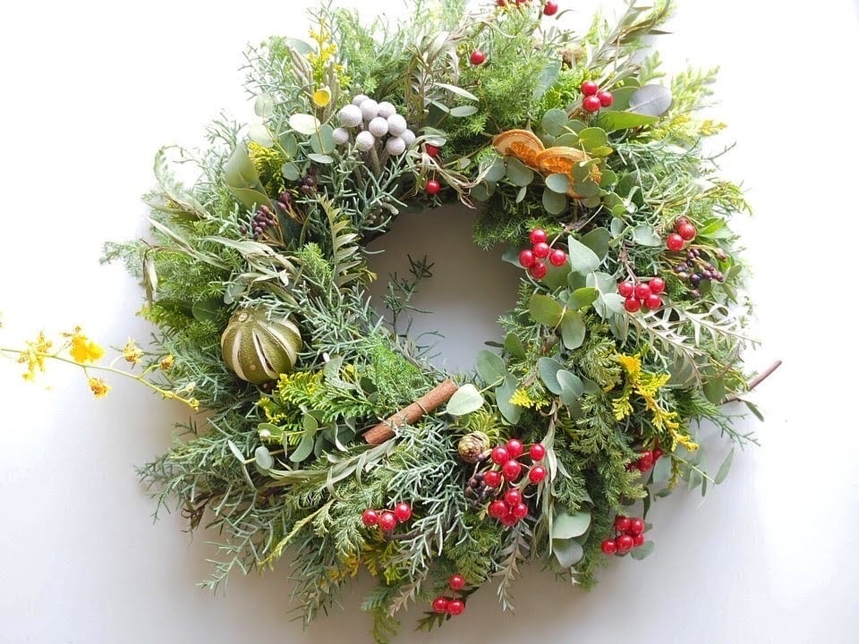 スッとしたさわやかな香りを放つ針葉樹をたっぷり使った【まんまるクリスマスリース(Lサイズ)】です。
