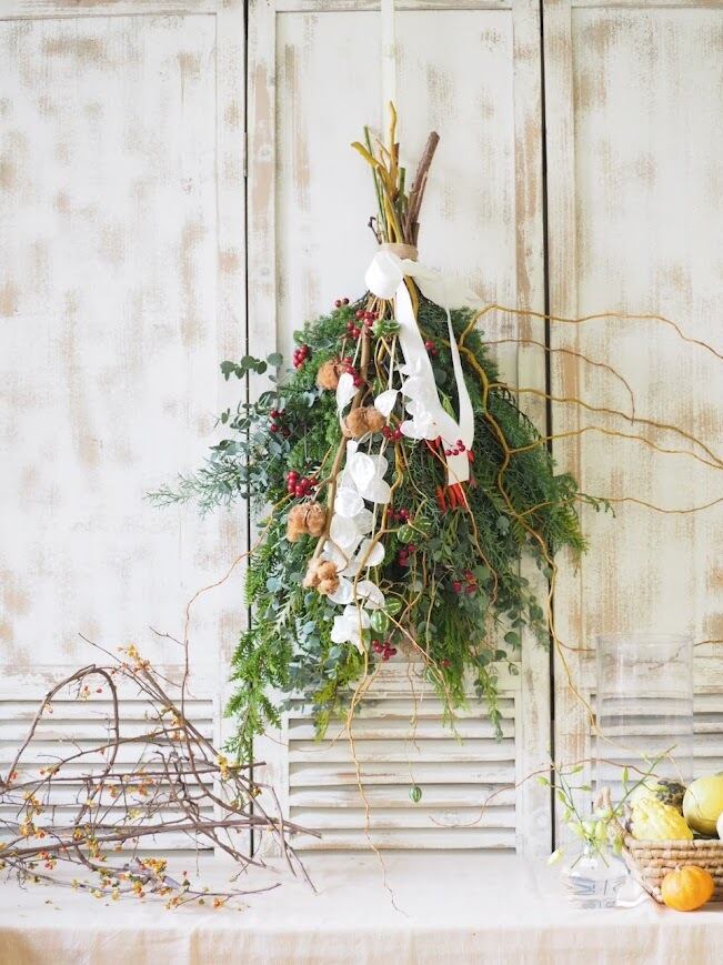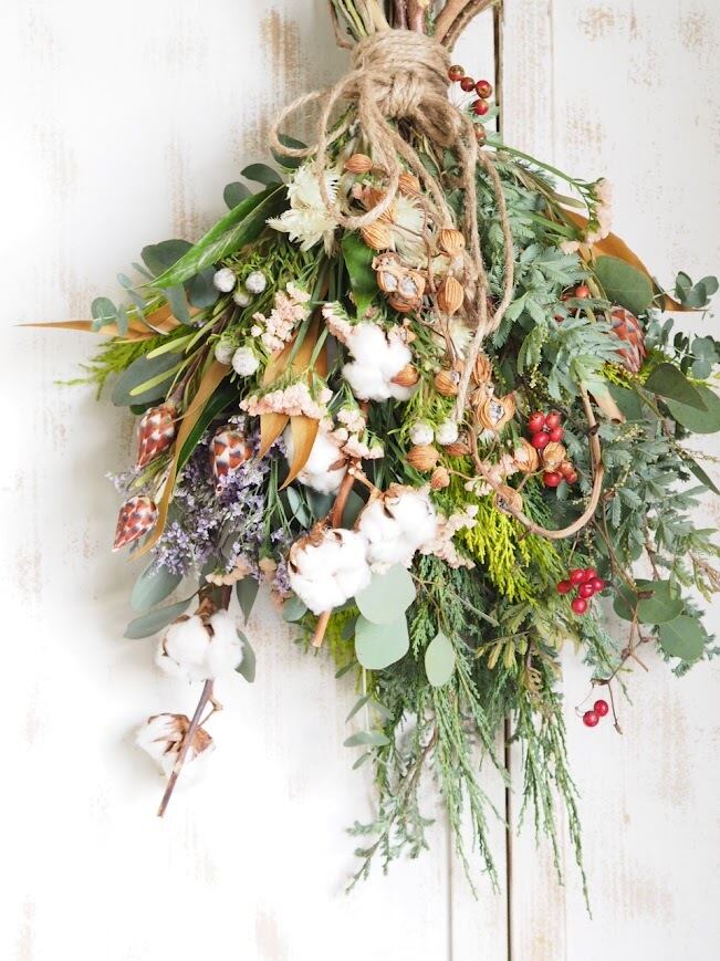 ●スワッグはホウキ型のリースのことで無造作に植物を束ねたナチュラルな雰囲気が人気の壁飾りです。
