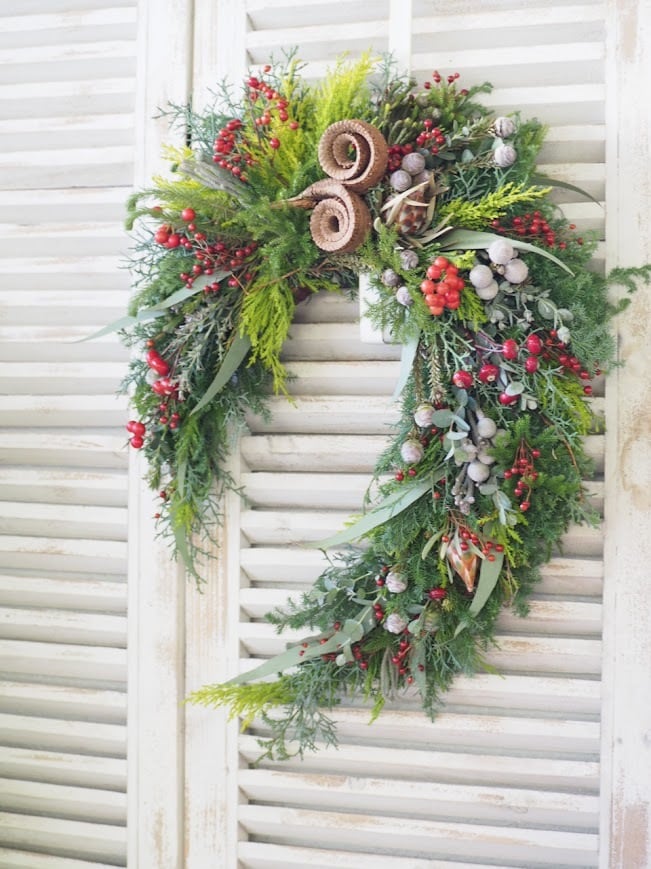 スッとしたさわやかな香りを放つ針葉樹をたっぷり使った馬蹄型のクリスマスリースです。